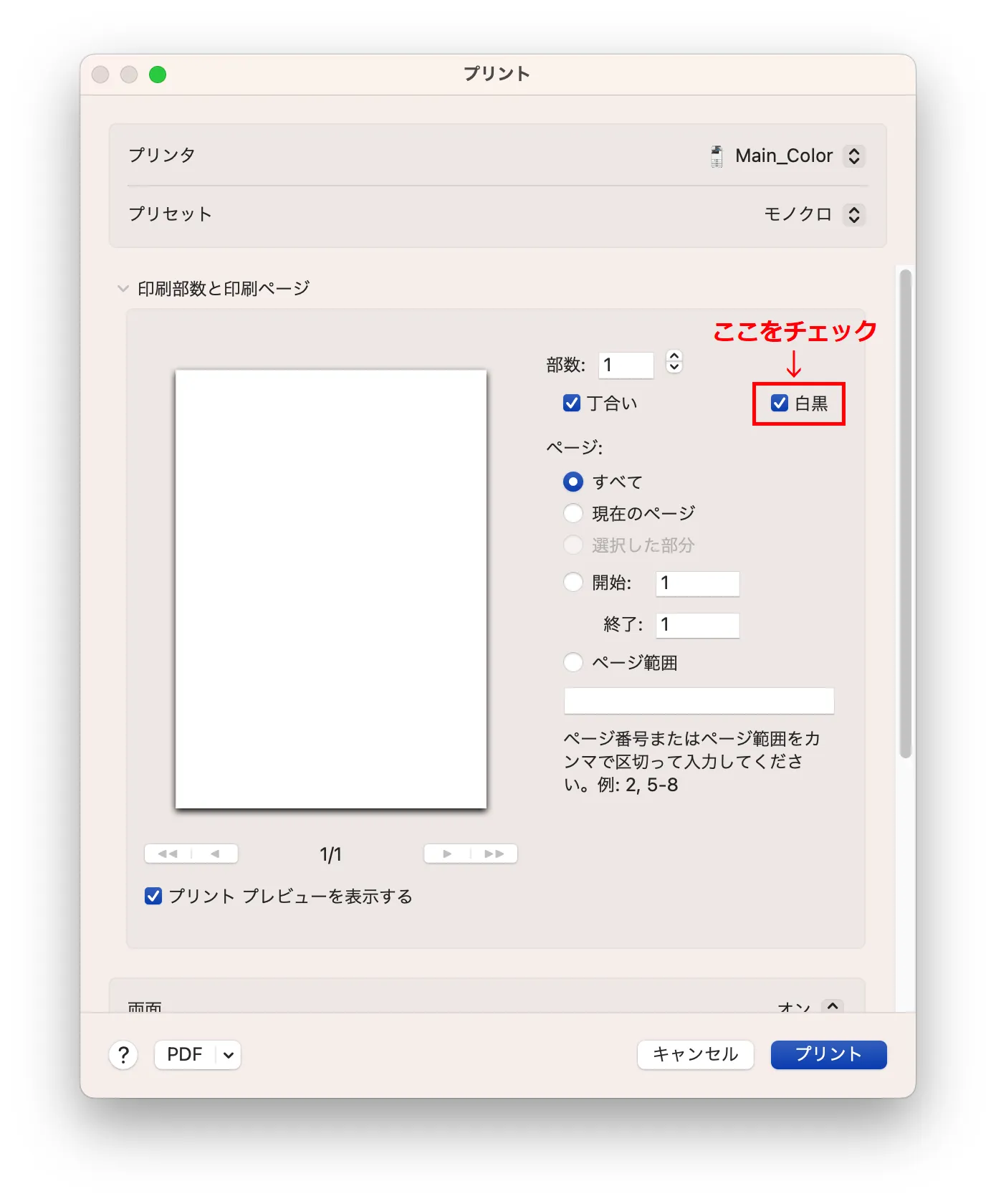 現在,Mac環境ではMain_Monoを選択できないため,Main_Colorを選択したうえで,下の画像のように,プリセット設定で「モノクロ」を選択してください.「モノクロ」以外を選択すると,黒文字だけの文書であってもカラー印刷として扱われ,カラー印刷料金が課金されてしまいます.