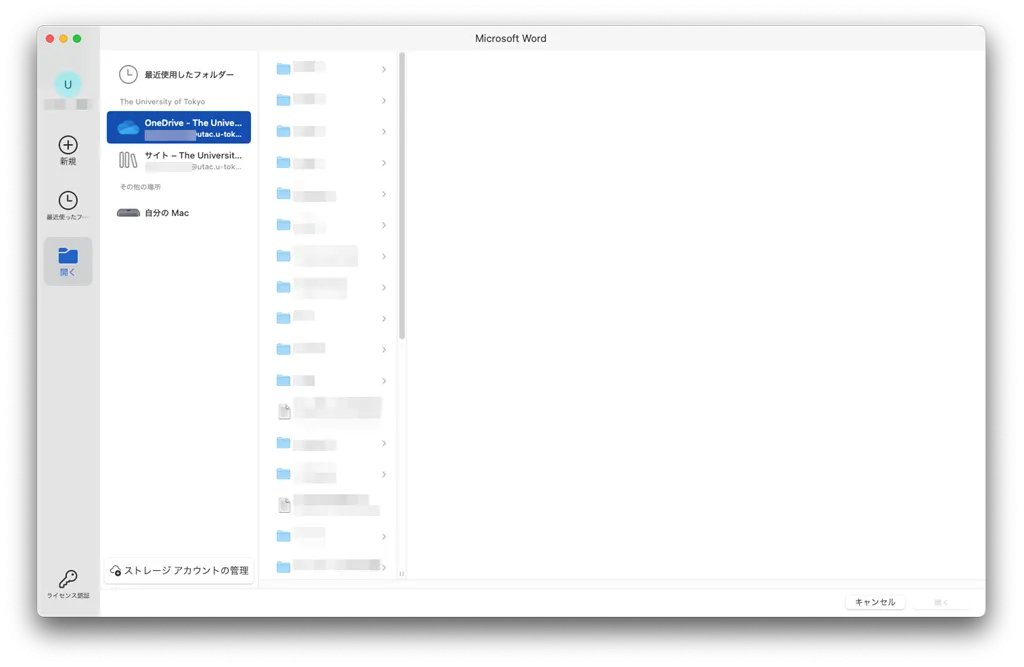 Mac環境のOfficeアプリでは,利用に際してライセンス認証のための操作は不要です.Officeアプリを起動後そのまま利用できます.