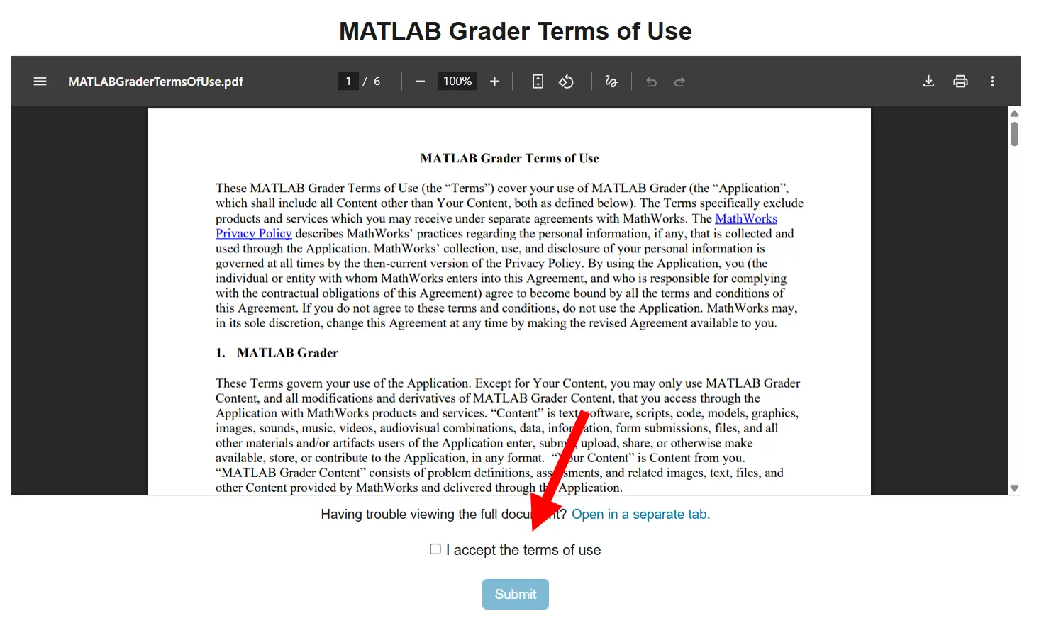 3. If the following “MATLAB Grader Terms of Use” screen appears, please review the content, check “I accept the terms of use”, and click “Submit”.
