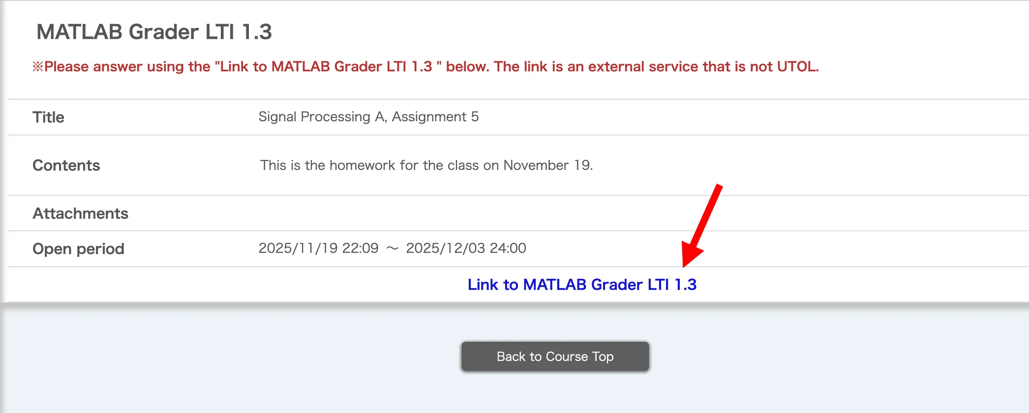 2. When you click on the title (in the above screen, “Signal Processing A, Assignment 5”), it transitions to the following screen, displaying details such as the content and the publication period. Check the “Content”, etc., and click on “Link to MATLAB Grader LTI 1.3”. The MATLAB Grader screen will open in a separate tab (or window).