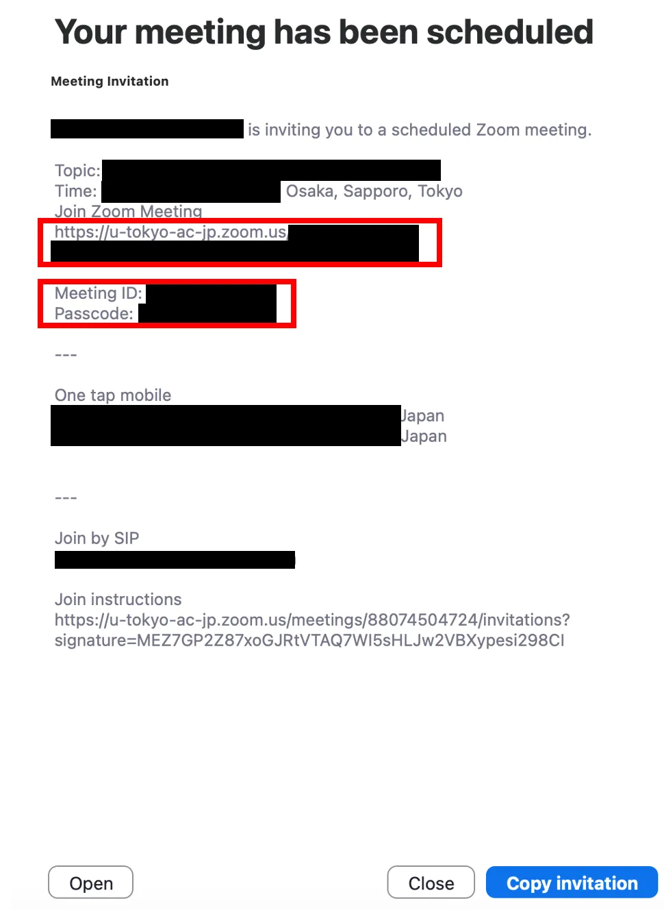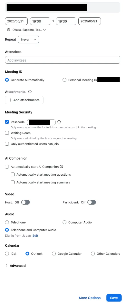 4. Press “Save” in the lower right corner. In the previous screen, if you selected “Other calendars” for “Calendar”, a screen such as that shown below will appear. Select the meeting URL, meeting ID, passcode, e.g., listed under “Join Zoom Meeting” and notify the participants by e-mail.