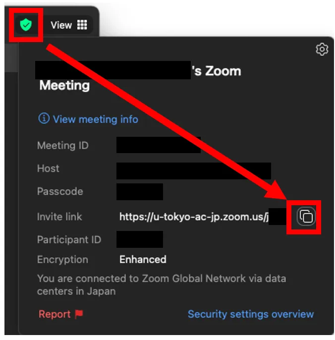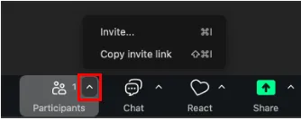 1. When the meeting starts, notify the participants by pressing “^” next to “Participants” on the meeting screen and “Copy invite link” or by “Copy Link” from the green shield symbol at the top of the meeting screen and sending the link to the participants.