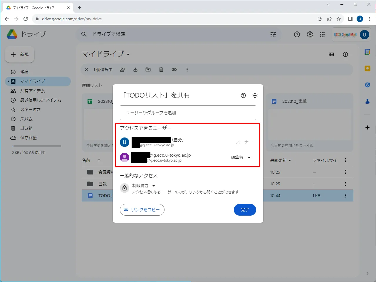 1. 共有設定画面を開いた後,「アクセスできるユーザー」欄にこれまでに共有した相手が一覧表示されます.削除・変更したい共有相手を探してください.