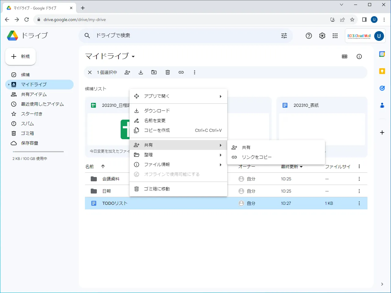1. Googleドライブ内で,共有したいファイル・フォルダが存在するフォルダに移動してください.