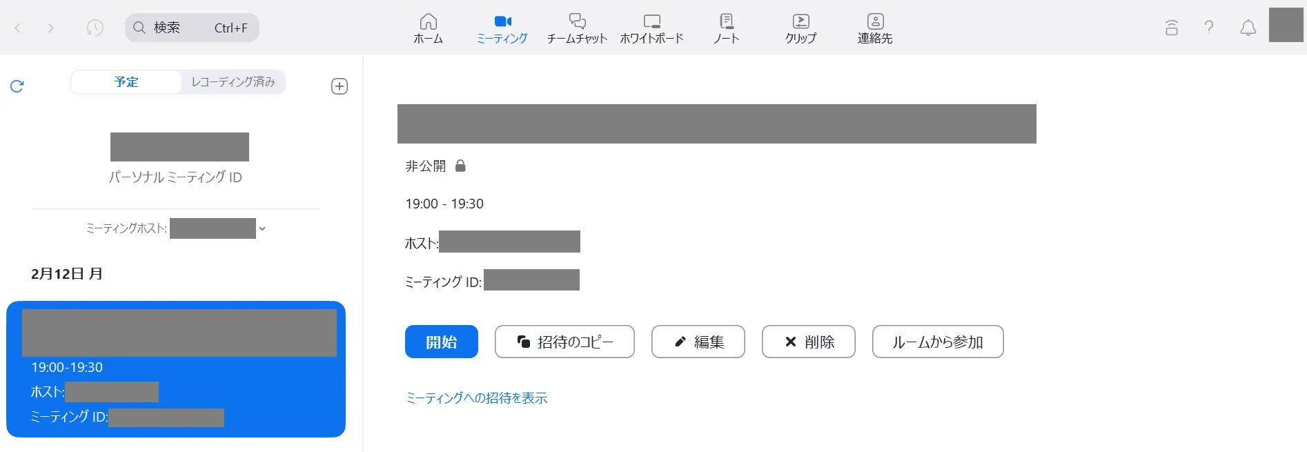 - 対象とするミーティングにカーソルを合わせると,新しく「編集」が表示されます.これを選択してください.