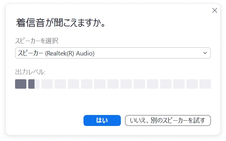 - 問題がなければ「はい」を押してください.問題があれば「いいえ,別のスピーカーを試す」のボタンを押すか,別のスピーカーを選択して同様に確認してください.