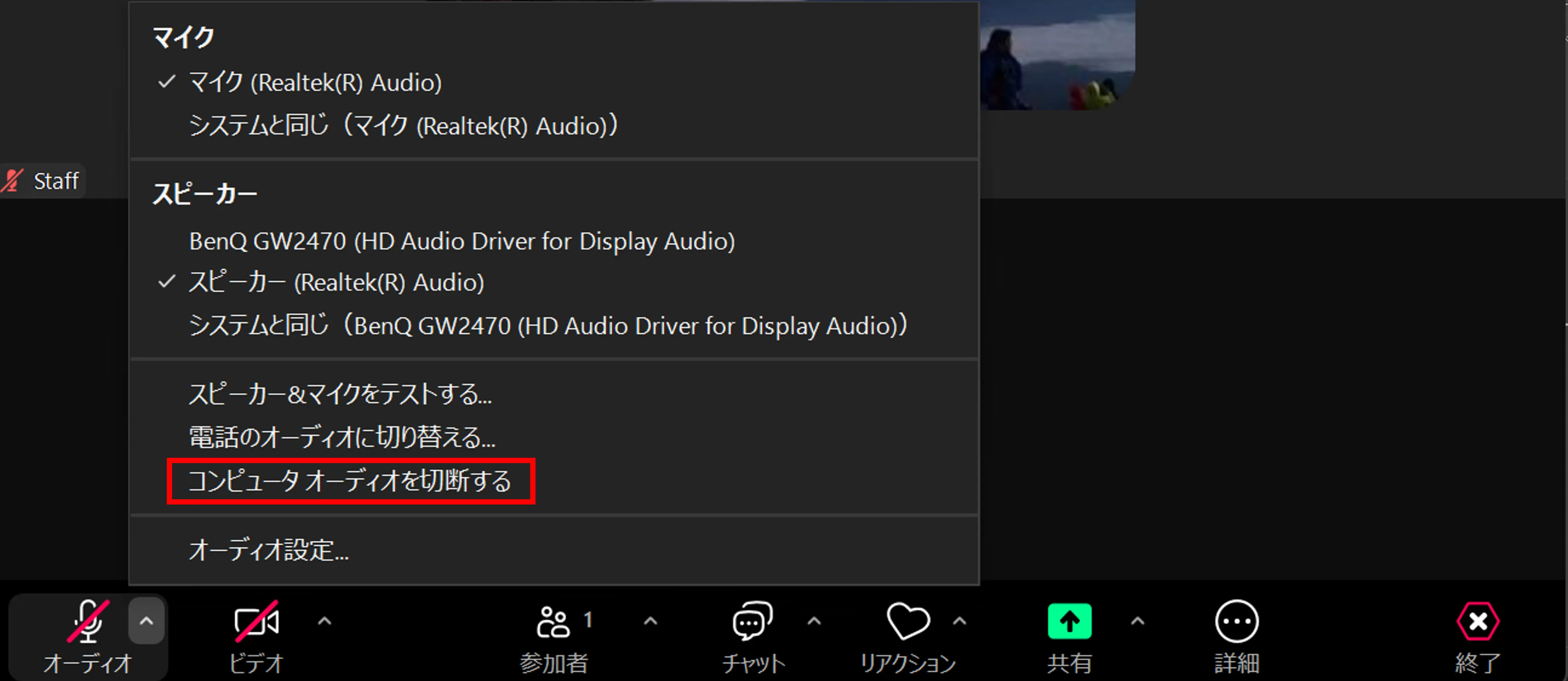 「詳細」と書かれたボタンを押すと表示されるメニューの一番下にある「オーディオの切断」を押してください.